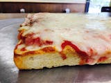 Thick crust square pizza with tomato sauce, mozzarella, and basil.